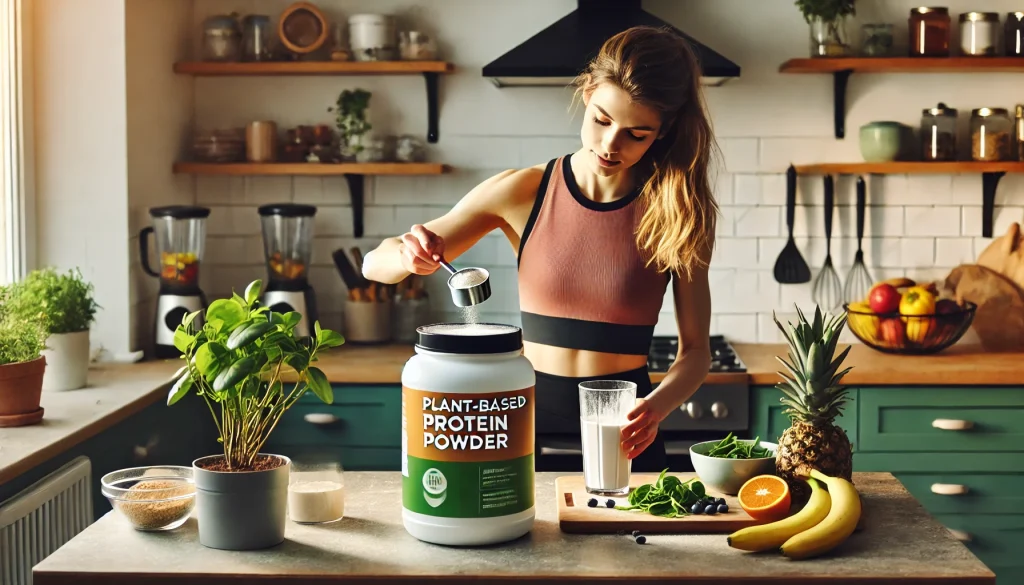 ALT TAG: A young athletic woman in a bright kitchen scooping plant-based protein powder into a blender.