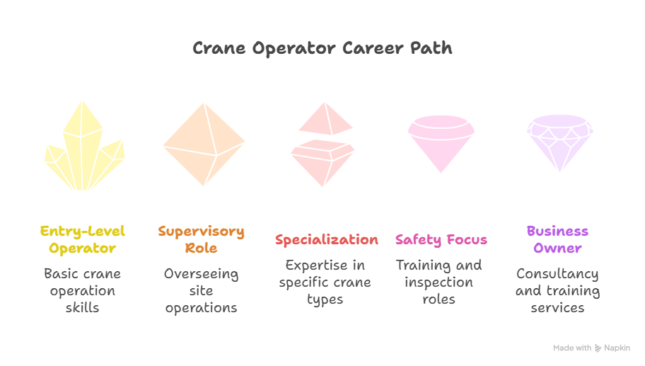 Many employers prefer candidates with practical worksite experience. Entry-level roles may involve assisting senior operators, rigging, or working as a signal person before progressing to full operator duties.