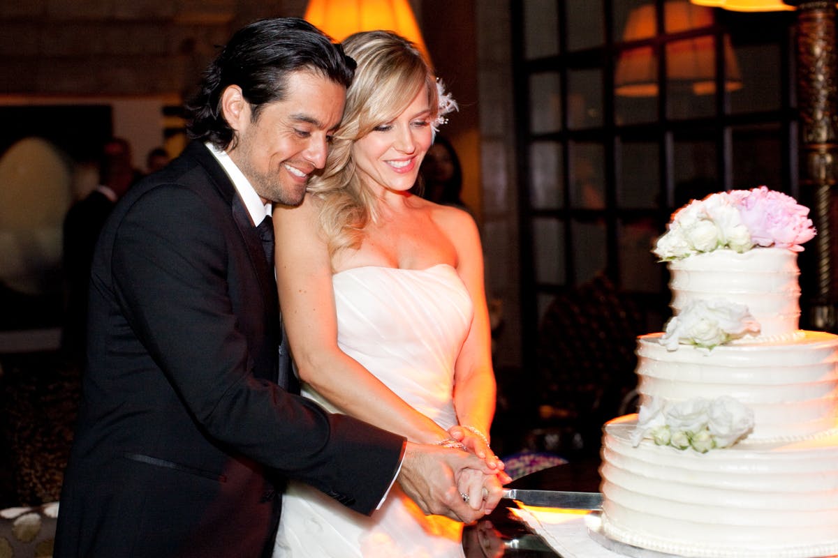 Rich and Julie were married on May 5, 2012, at the famed John Sowden House in Los Angeles. Julie looked stunning in a strapless THEIA gown and held a bouquet of pink and white peonies at their colorful Cinco de Mayo-themed wedding.