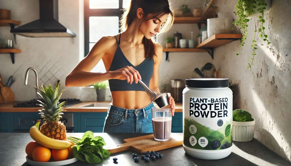 ALT TAG: A young athletic woman in a bright kitchen scooping plant-based protein powder into a blender.