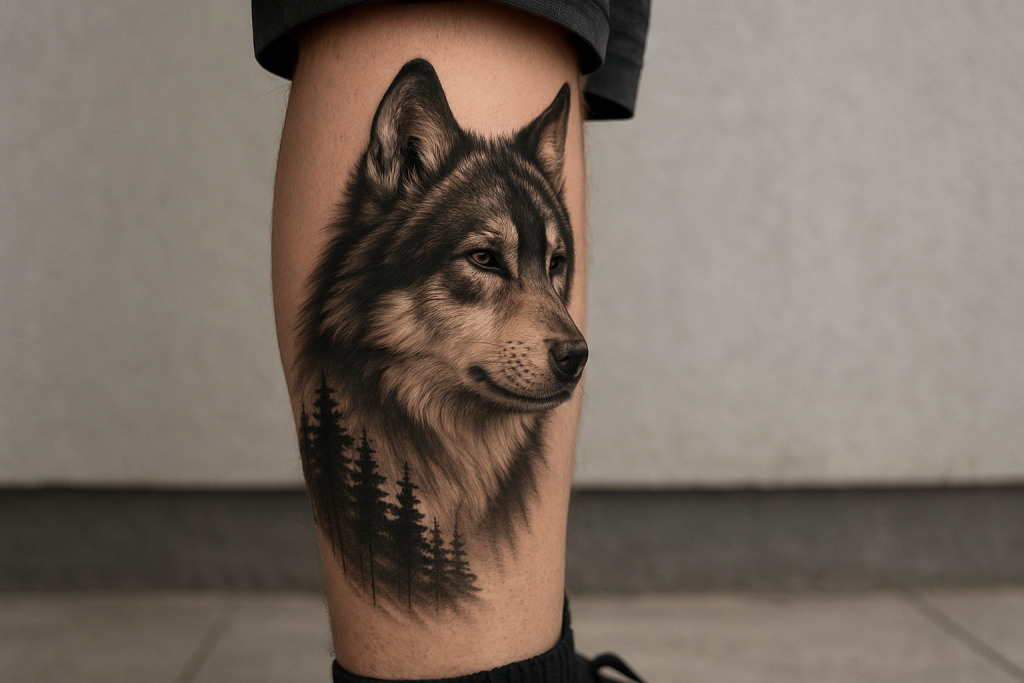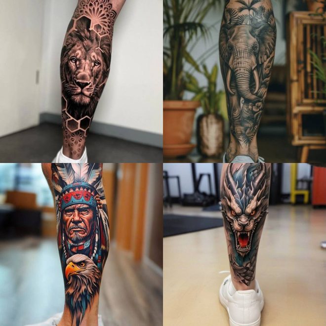 On the leg, animals come to life. A wolf howling at the moon on the calf or a tiger leaping up the thigh looks dynamic and bold. These tattoos are personal and powerful, making them favorites for many men.