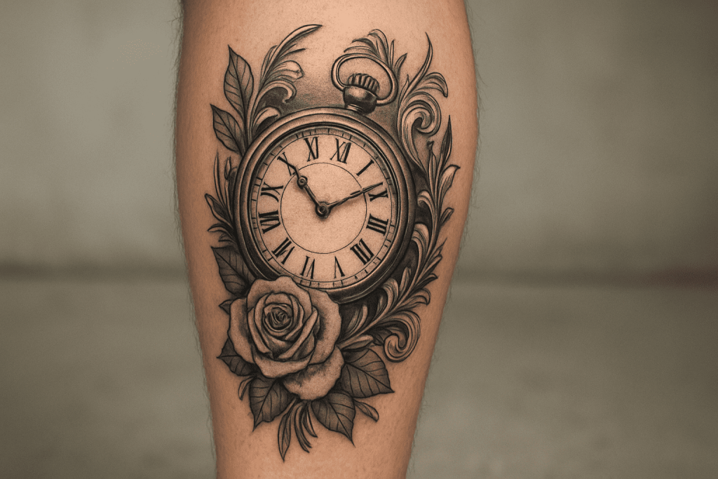 There are numerous ways to design clocks on the leg. While a detailed pocket watch tattoo depicts life’s continuous journey, a broken clock can stand for lost time. Clock tattoos, frequently combined with skulls or roses, serve as creative reminders that every second matters.