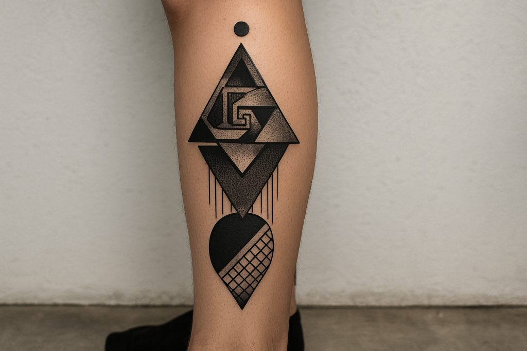 Geometric tattoos stand out on the leg due to their long, straight lines and inherent symmetry. A calf with a geometric sleeve can appear bold and futuristic.