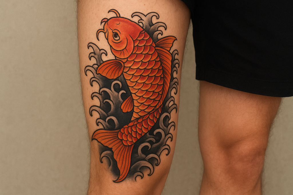 The leg is one of the best spots for Japanese tattoos because they often tell full stories. A koi swimming upstream with waves and blossoms surrounding it can take up the entire thigh. Add a samurai or dragon, and you’ve got a dramatic full-leg design.