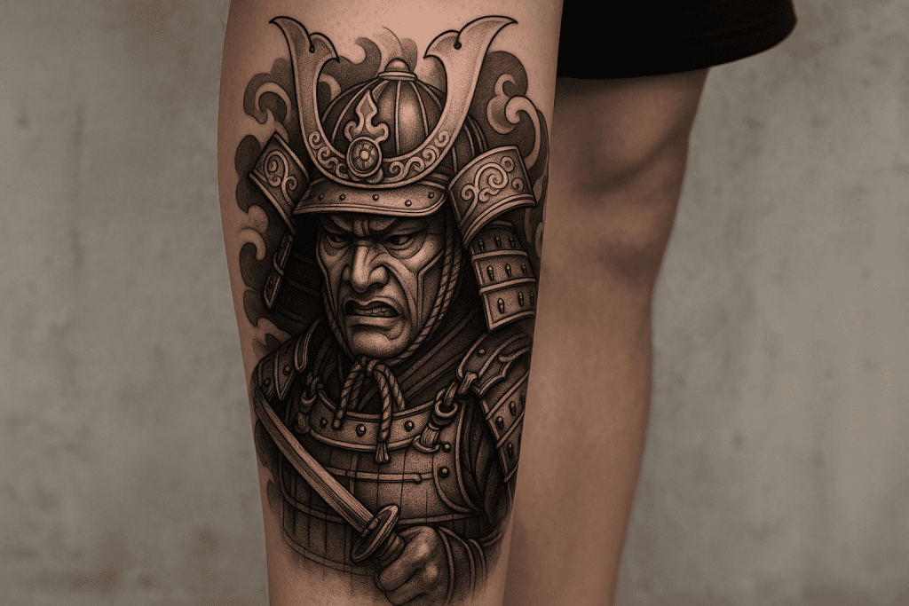 On the leg, samurai tattoos shine because of their detail. A full samurai in armor, complete with sword and background, can stretch across the thigh or even down the entire leg. Add cherry blossoms or waves for extra symbolism, and you’ve got a masterpiece of meaning.