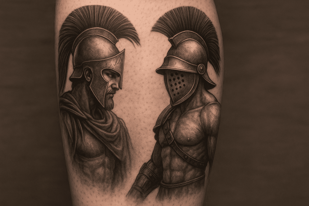 Spartan and Gladiator tattoos stand for bravery, integrity, and resilience. While a complete battle scene on the thigh depicts a dramatic tale of bravery, a Spartan helmet on the calf looks fierce.