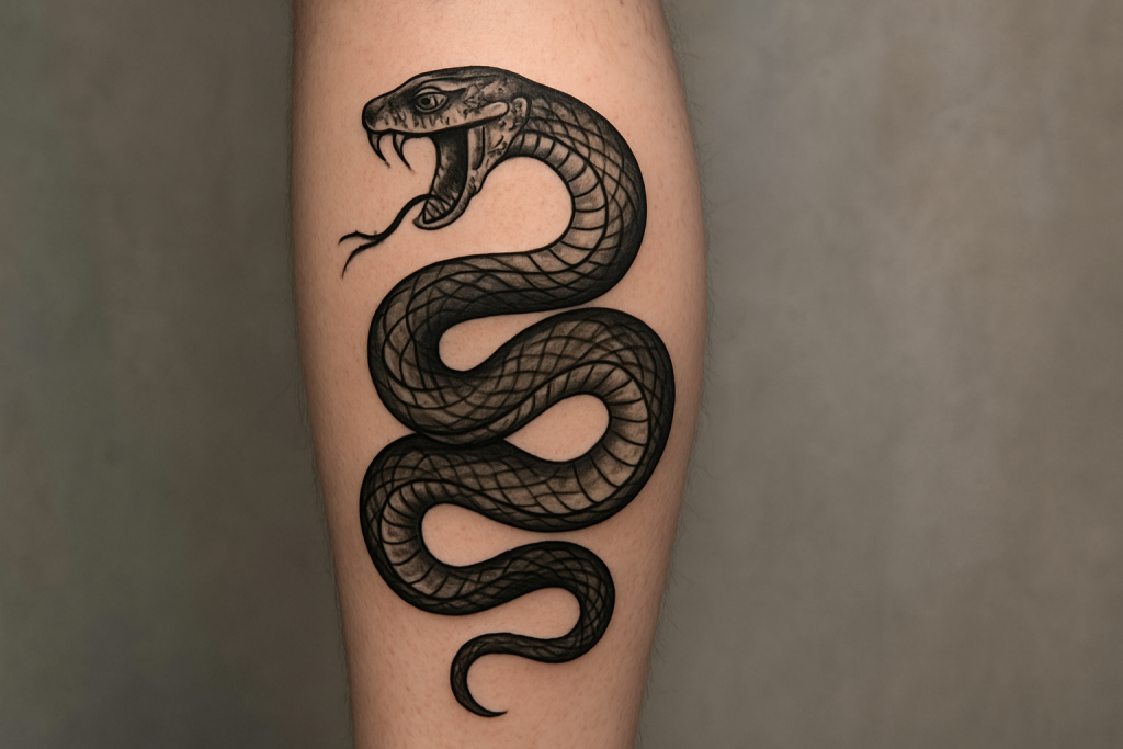 Snakes appear remarkably lifelike on the leg. The tattoo feels alive because of the way their bodies naturally coil around the thigh or calf. Snake tattoos are powerful, ferocious designs, whether they are realistic black-and-gray or colorful Japanese styles.