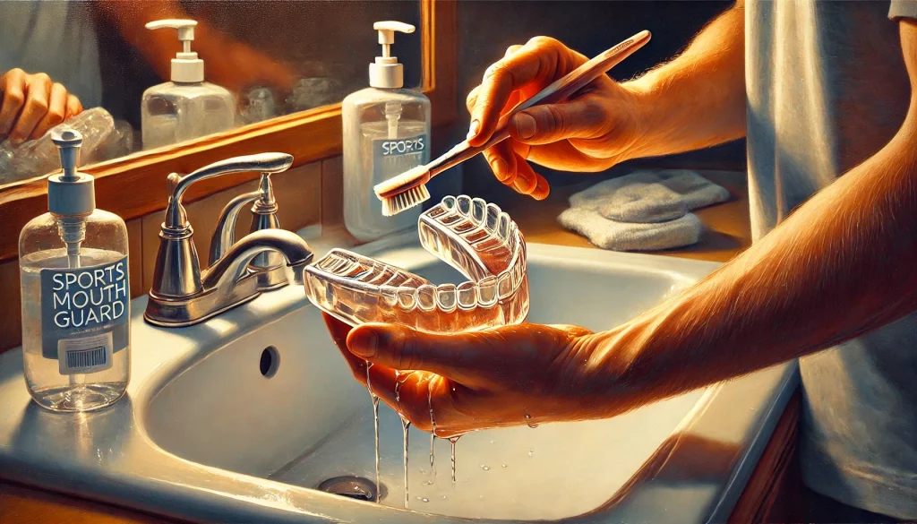 ALT TAG: A realistic painting of a person carefully cleaning a sports mouth guard at a sink
